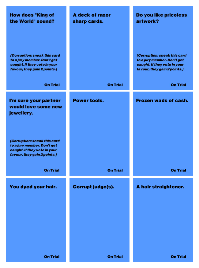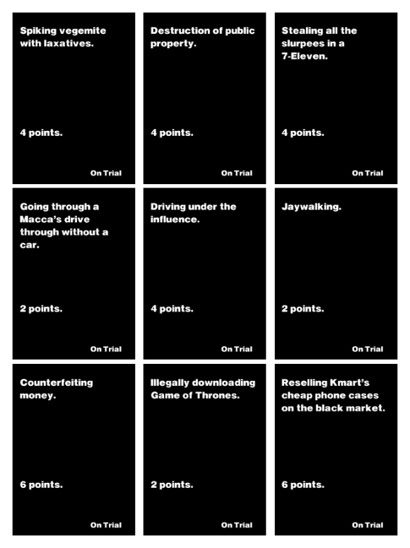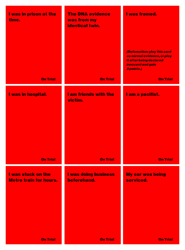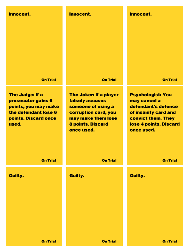 The game was originally designed in response to a brief supplied by Swinburne’s law faculty. As such, it was tailored to their specifications. Its gameplay was inspired by roleplaying games and party games like Cards Against Humanity, while the reminder text for various mechanics was adopted from trading card games like Magic: The Gathering. Once that unit was completed, with the other designers’ permission, I did further tinkering with the cards and leaned a bit more into the Cards Against Humanity influences, so the final version of On Trial is a little less classroom-friendly.