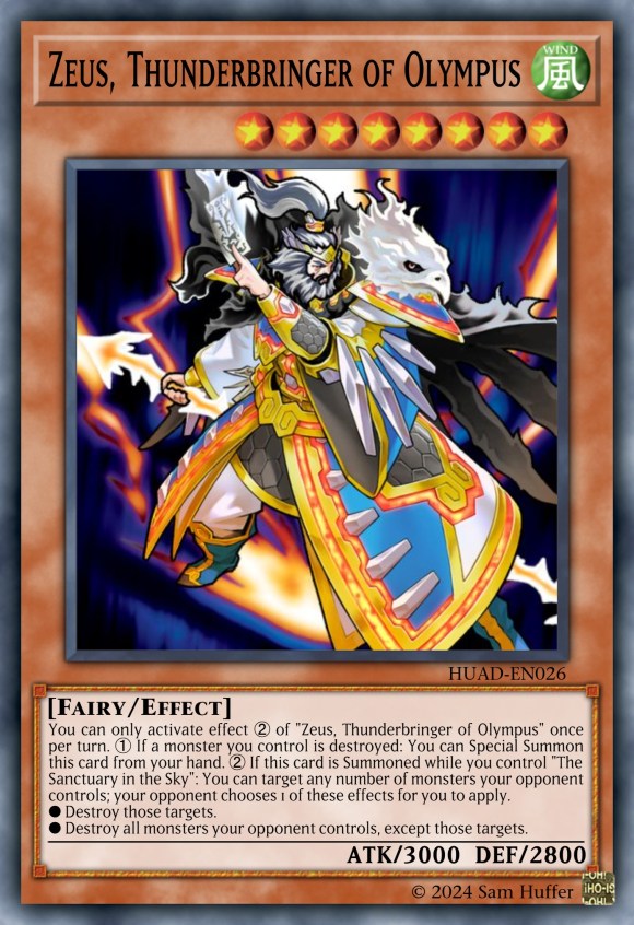 When Zeus shows up in Thunderbringer after his crew kills one of Helios’s cows, he forces Odysseus to choose between sacrificing himself or his crew as punishment. To me, that screamed of a board wipe card effect, but choosing between 1 card and everything else didn’t seem like a great choice unless your opponent had 1 very powerful monster out that was worth all the rest. Then I remembered Mark Rosewater describing a Spike-y (i.e. competitive player-oriented) Magic: The Gathering card that let you put your opponent’s cards into 2 piles and they then had to choose which pile to send to the graveyard. That seemed like a perfect way to represent Zeus’s ultimatum, so I replicated that effect with Yu-Gi-Oh!‘s syntax for Zeus. I tied that effect to The Sanctuary in the Sky, which is basically Yu-Gi-Oh!‘s rendition of Olympus, to prevent Zeus from being splashed into just any deck for his board wipe effect, and gave it a hard once per turn restriction to prevent The Sanctuary in the Sky decks from looping Zeus to abuse the effect. To round out the card, I gave him an effect to Summon himself when one of your monsters (i.e. Helios’s cows) is destroyed.