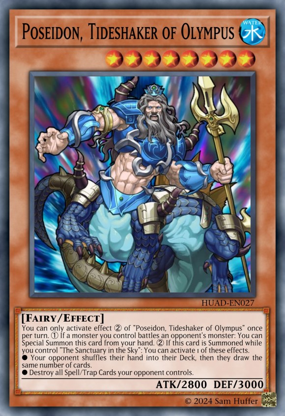 Poseidon is more of a major character in EPIC than Zeus, slaughtering the bulk of Odysseus’s crew in Ruthlessness as retribution for blinding Polyphemus, and confronting Odysseus again in Get in the Water and Six Hundred Strike. That didn’t make brainstorming any easier for Poseidon, as my first impulse would be another board wipe effect, but Zeus already had that covered. At least, for monsters. With Poseidon using storms to interfere with Odysseus and his crew’s return to Ithaca and storm-themed in Yu-Gi-Oh! often destroying Spell/Trap cards, I opted to give Poseidon a Spell/Trap board wipe effect, also tied to The Sanctuary in the Sky. However, with modern Yu-Gi-Oh!‘s focus on hand traps and actual Trap cards being powercrept into oblivion, I figured giving Poseidon the option of resetting the opponent’s hand might be a reasonable alternative. Since he entered EPIC‘s story after Odysseus fought Polyphemus, I opted to let him Summon himself if another monster battled first.