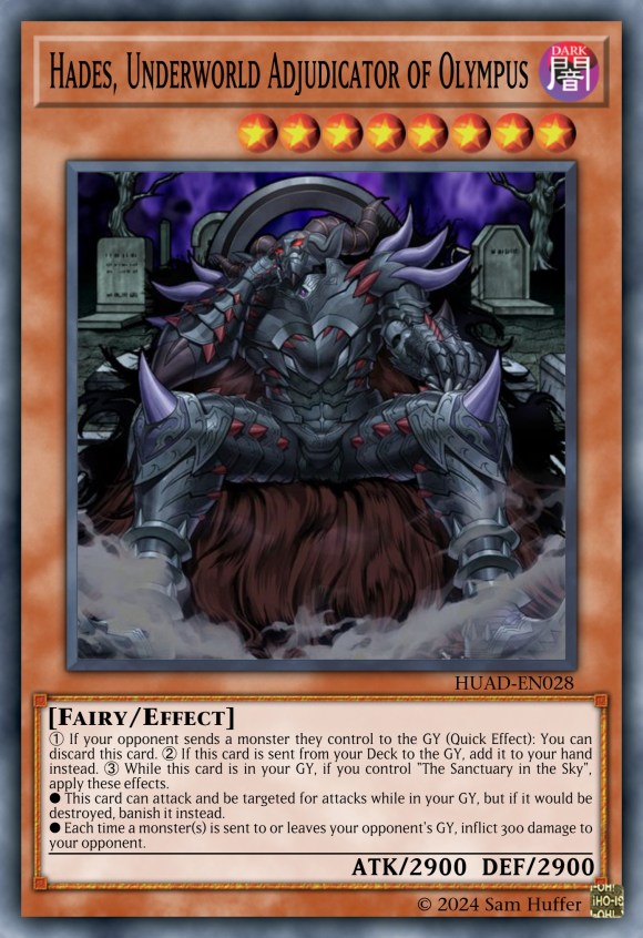 Unlike Zeus and Poseidon, Hades does not appear in EPIC: The Musical, so my design for him is based on my general knowledge of Hades from Greek mythology. As the lord of the underworld that generally stays in his domain, I figured that he would prefer to operate from his domain, so I gave him the effect of being able to battle while The Sanctuary in the Sky is on the field. Inflicting damage for each monster that goes to the graveyard also seemed appropriate. I don’t think Hades would be too happy about people who are supposed to be in the underworld escaping it as a general rule, so I made that effect apply when monsters left the graveyard as well. Since he wants to be in the graveyard to manage the dead, I made his Summoning condition discard him instead when your opponent sends a monster to the graveyard. To prevent you from just bypassing his “Summoning requirements” with cards like Foolish Burial, I also added the effect to add Hades to your hand instead if he’s milled.