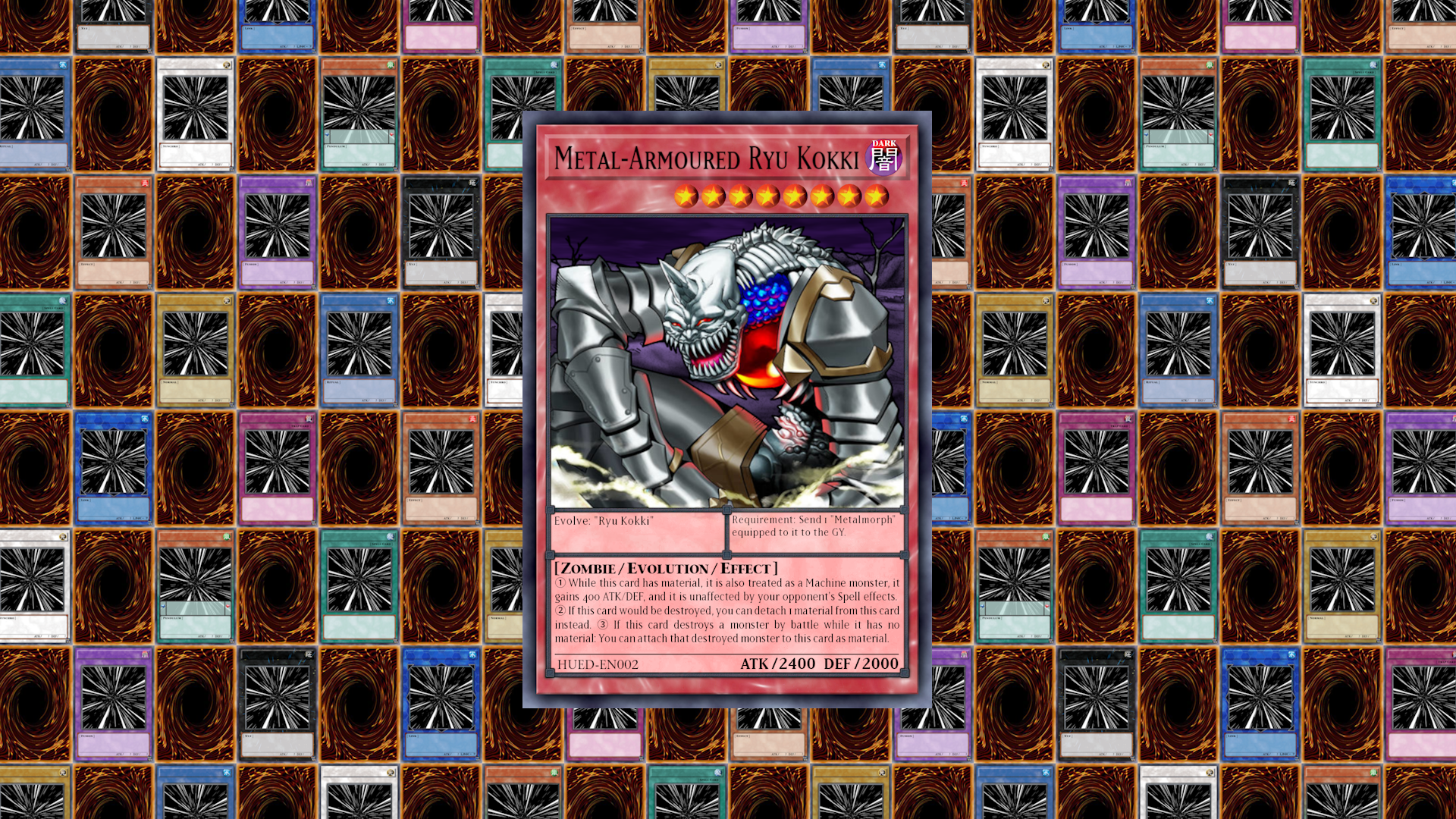 Metal-Armoured Ryu Kokki is based on Ryu Kokki and the Metal counterpart series. Its art is Ryu Kokki’s Chinese Duel Links art that censors the skulls on its body using metal armour, with the background replaced with Wasteland re-coloured to mimic Zombie World, but with the trees re-coloured to resemble Metal-Armoured Ryu Kokki’s armour. All of the card art was sourced from Yugipedia, except Ryu Kokki’s Chinese Duel Links art, which was sourced from this DeviantArt account that posts censored Chinese Duel Links art, since Yugipedia didn’t list it as one of Ryu Kokki’s artworks. The final card image was created in GIMP using my art for Metal-Armoured Ryu Kokki and Ray_V_Xyz’s Evolution Monster card frame, borrowed with permission, but modified in GIMP to restore the editable text fields, as GIMP can’t edit Photoshop’s text layers.